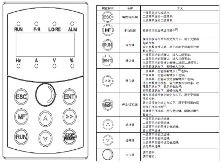 控制面板有啟動/停止旋鈕,速度調節旋鈕,變頻器顯示和設置小面板,還包括運行、蜂鳴、告警指示燈,*作簡單。